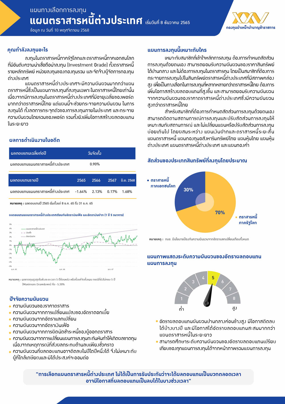เป็นแผนที่ลงทุนในตราสารหนี้ภาครัฐโลกและตราสารหนี้ภาคเอกชนโลกที่มีอันดับความน่าเชื่อถือน่าลงทุน (Investment Grade) ทั้งตราสารหนี้รายหลักทรัพย์ หน่วยลงทุนของกองทุนรวม และจัดจ้างผู้จัดการกองทุนต่างประเทศ แผนตราสารหนี้ต่างประเทศมีระดับความเสี่ยงปานกลางค่อนข้างสูง ช่วยกระจายความเสี่ยงการลงทุนได้ ทั้งลดการกระจุกตัวของการลงทุนภายในประเทศ และกระจายความเสี่ยงโดยรวมของพอร์ต รวมทั้งยังเพิ่มโอกาสสร้างผลตอบแทนในระยะยาว