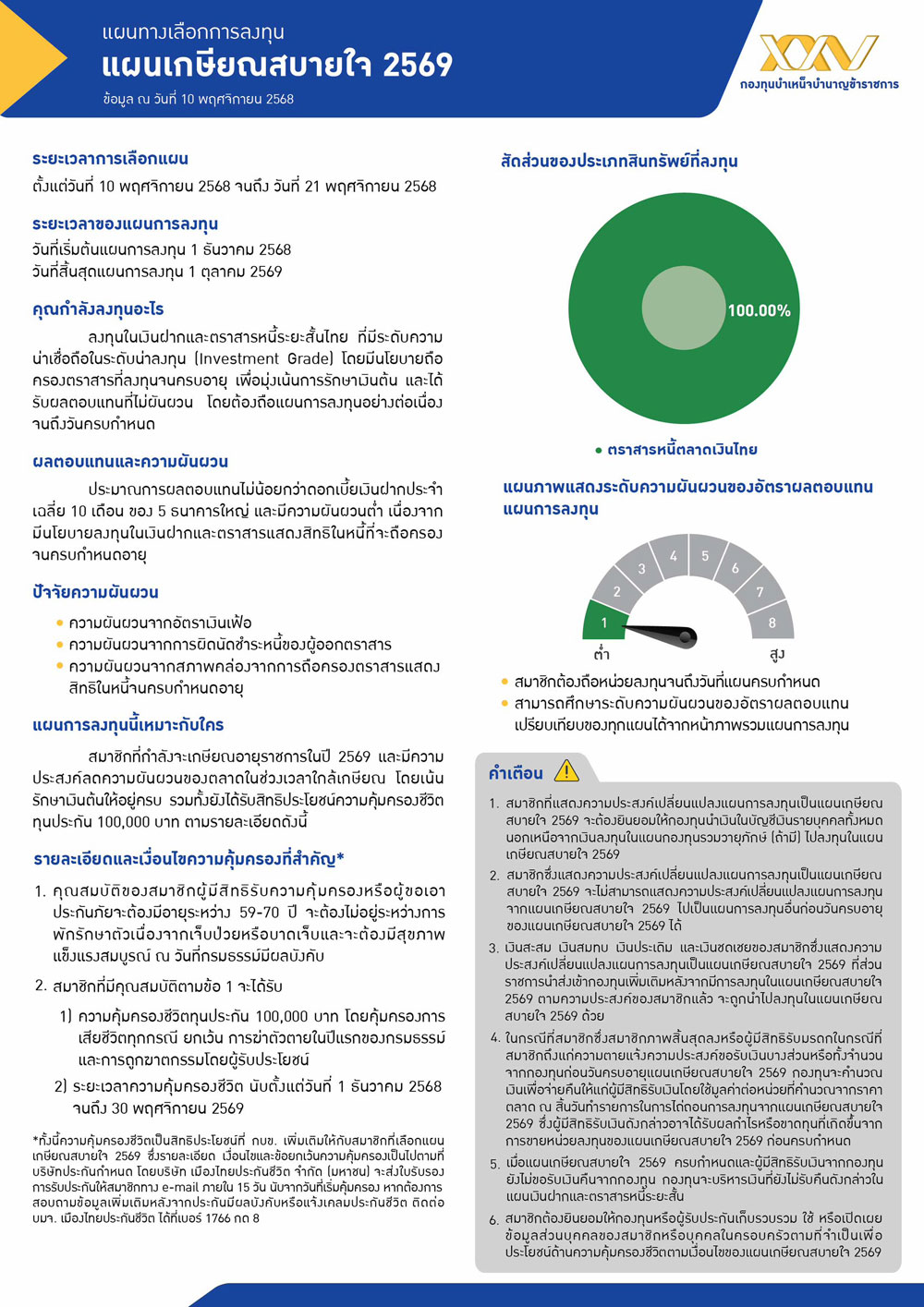 แผนเกษียณสบายใจ 2569 เป็นแผนการลงทุนที่ กบข. จัดทำขึ้นเป็นพิเศษสำหรับสมาชิกที่กำลังจะเกษียณอายุราชการในปี 2569 และมีความประสงค์ลดความผันผวนของตลาดในช่วงเวลาใกล้เกษียณ โดยเน้นรักษาเงินต้นให้อยู่ครบ รวมทั้งยังได้รับสิทธิประโยชน์ความคุ้มครองชีวิตทุนประกัน 100,000 บาท