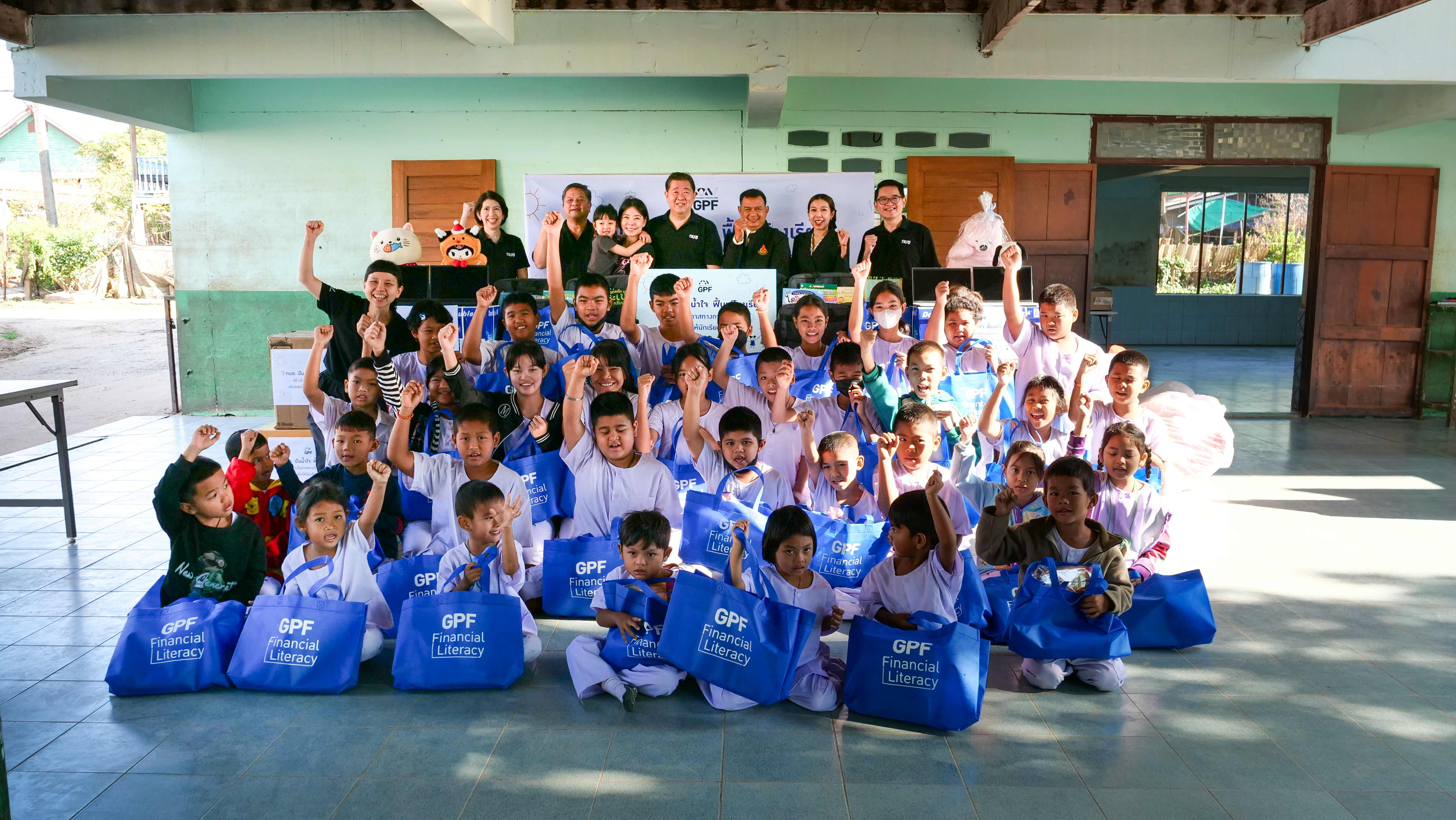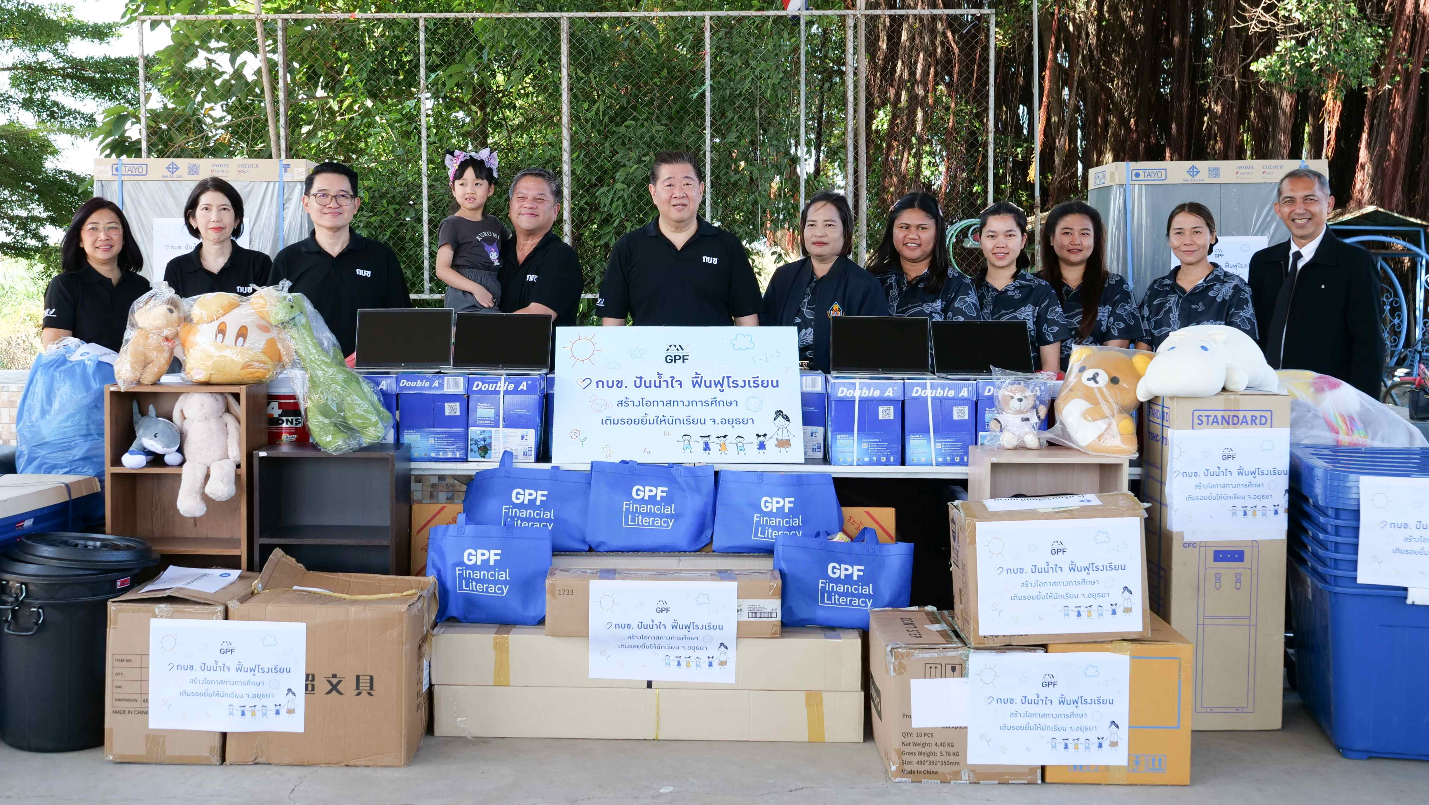 ซึ่ง กบข. ได้จัดเตรียมสิ่งของที่จำเป็นและตามความต้องการของโรงเรียน อาทิ อุปกรณ์ซ่อมแซมและปรับปรุงอาคาร อุปกรณ์การเรียนการสอน อุปกรณ์กีฬาและเครื่องแต่งกาย เป็นต้น นอกจากนี้ กบข. ยังได้เชิญชวนพนักงาน กบข. ร่วมบริจาคของเล่นและตุ๊กตา เพื่อเป็นการให้กำลังใจและสร้างรอยยิ้มให้แก่น้อง ๆ ในโรงเรียนที่ได้รับผลกระทบ